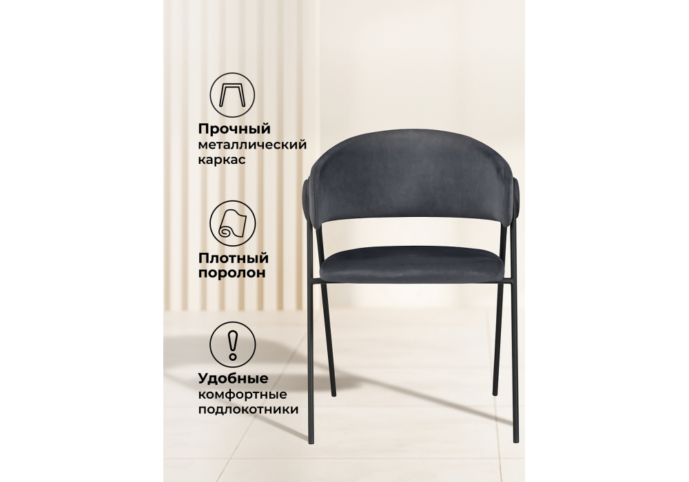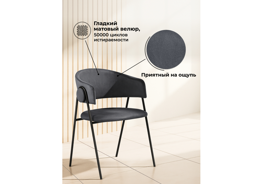 ✔ Прочный металлический каркас – обеспечивает максимальную долговечность и устойчивость конструкции. Рассчитан на интенсивное использование. ✔ Практичный матовый велюр – приятный на ощупь и исключительно износостойкий. Высокий показатель в 50 000 циклов истираемости гарантирует, что обивка надолго сохранит свой безупречный вид. ✔ Эргономичная посадка – благодаря плотному поролону и удобным комфортным подлокотникам, стул обеспечивает приятное расслабление во время долгих посиделок. ✔ Высокая нагрузка до 130 кг – надежная конструкция и усиленный каркас делают стул подходящим для любого пользователя.