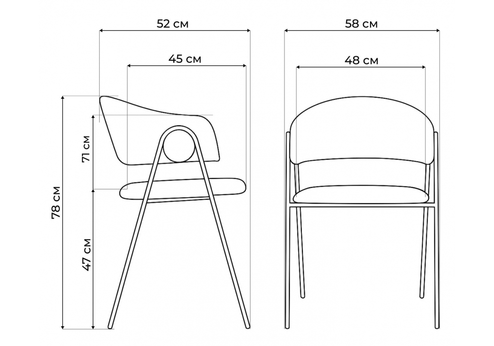 Стул Ширина 68 см x Глубина 60 см x Высота 75 см Сиденье Ширина 54 см x Глубина 59 см x Высота 48 см Подлокотники Высота: 75 см Каркас: металл Сиденье: ткань